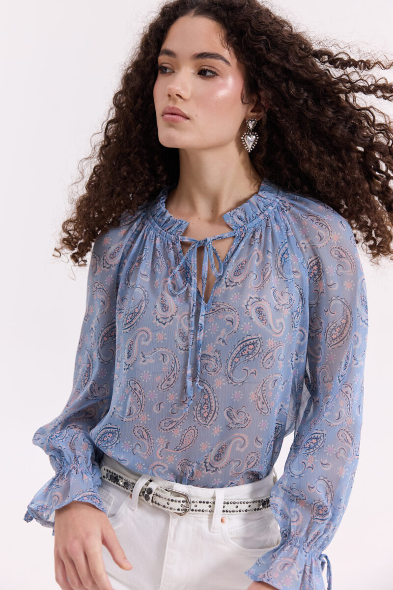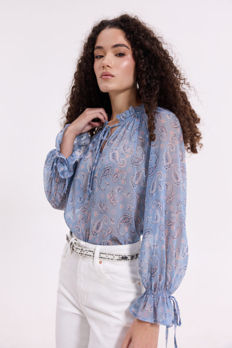 Μπλούζα σιέλ εμπριμέ ζορζέτα